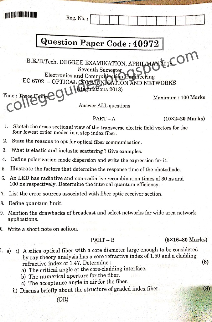 EC 6702 Optical Communication and Networks r2013 Anna University Question paper Apr/may 2018