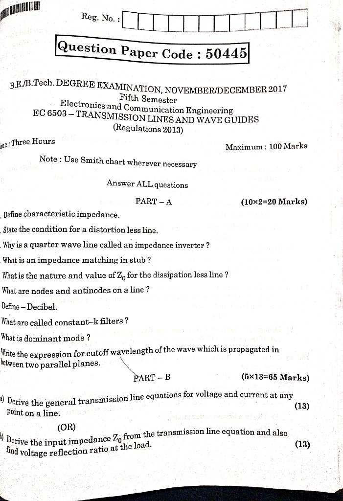 EC 6503 Transmission Lines and Wave Guides r2013 Anna University Question Paper-Nov/Dec 2017