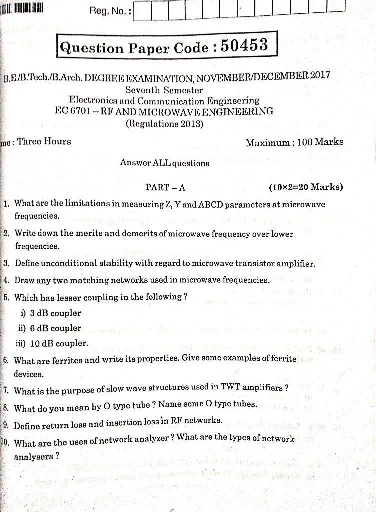 EC 6701 RF and Microwave Engineering r2013 Anna University Question Paper-Nov/Dec 2017